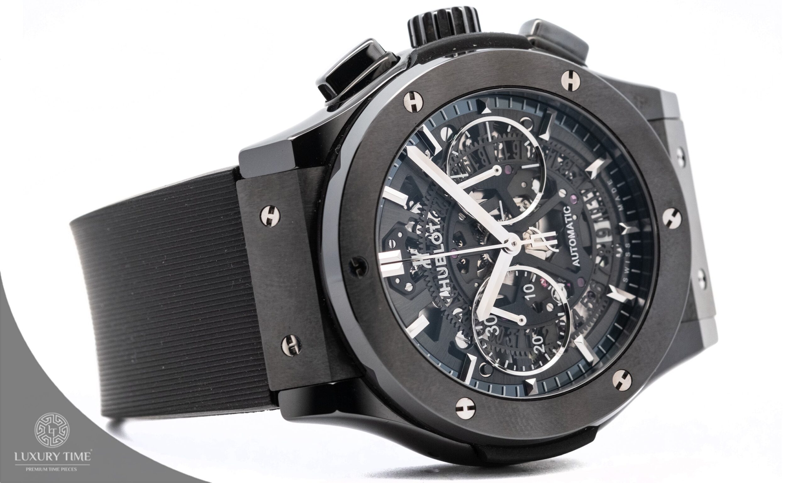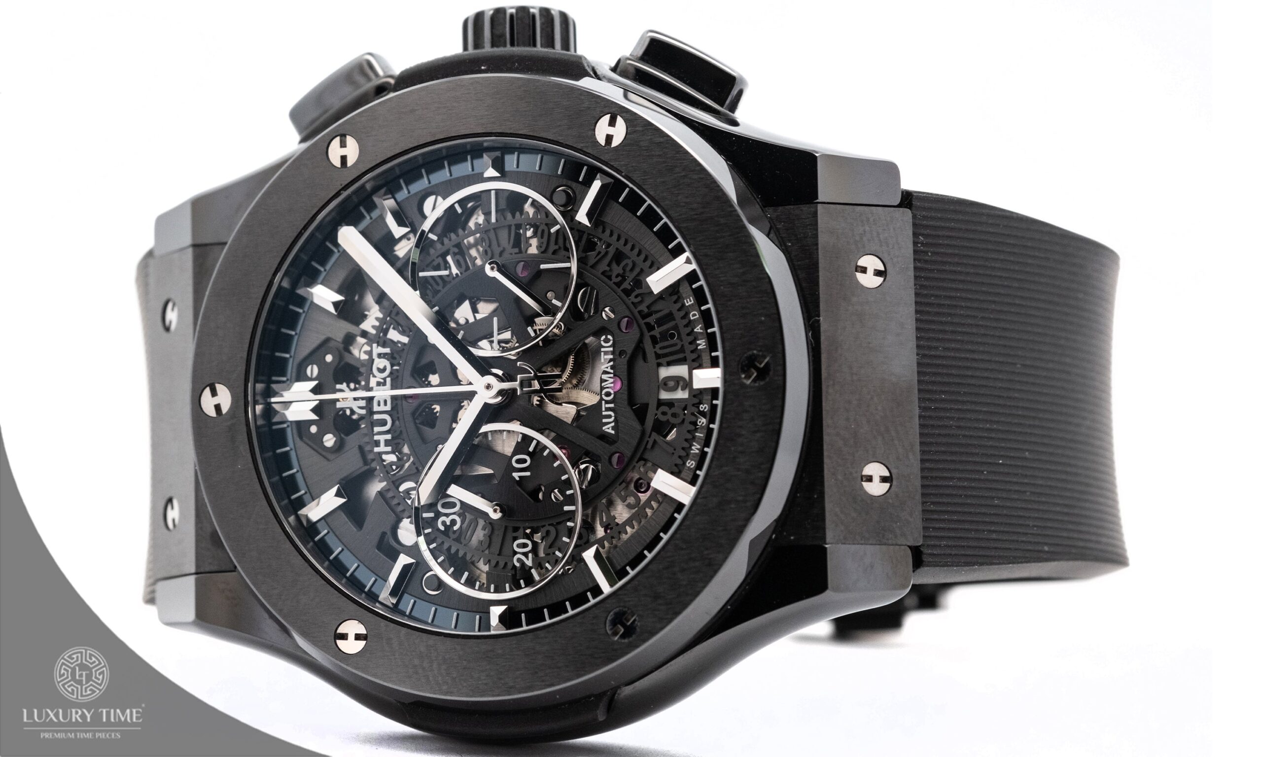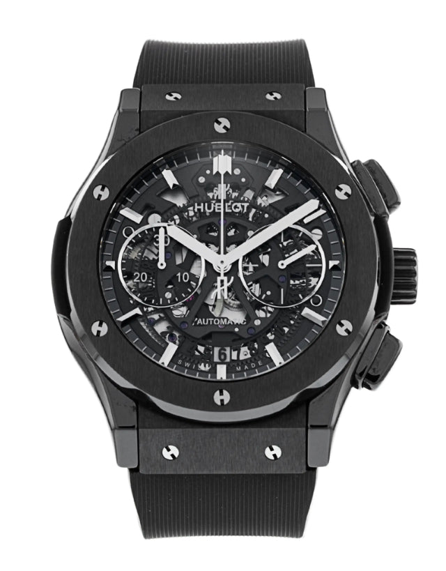 The Hublot Classic Fusion showcases a bold 45mm black ceramic case and a striking skeletonized black dial. Complemented by a black rubber strap and a push-button folding clasp, this timepiece combines modern design with practicality. Powered by an automatic movement, it features a transparent case back, a fixed bezel, and a scratch-resistant sapphire crystal for enhanced durability.