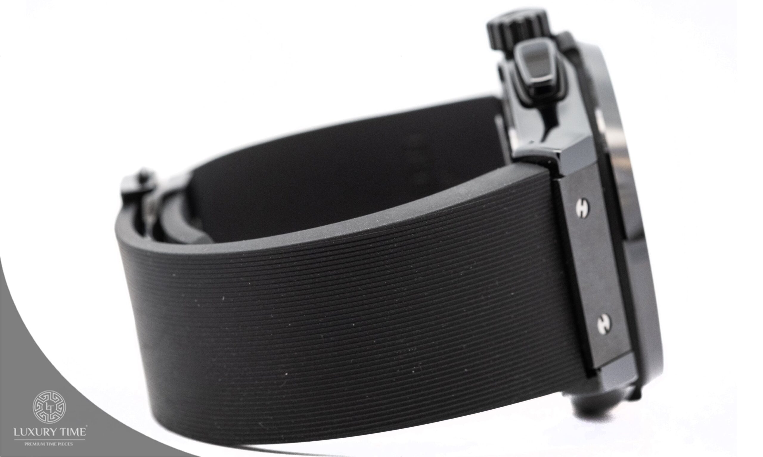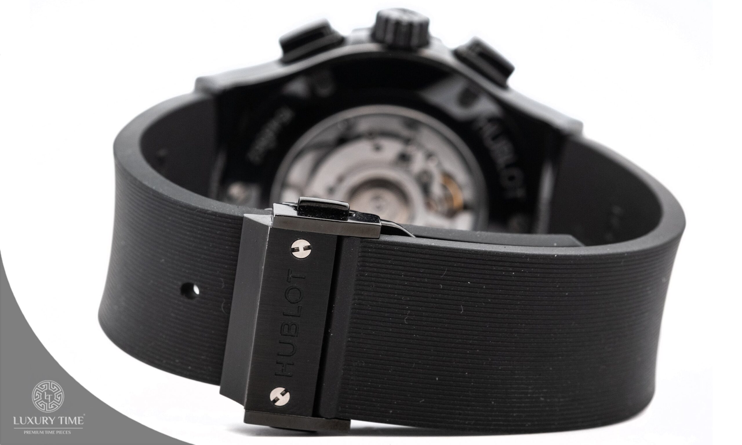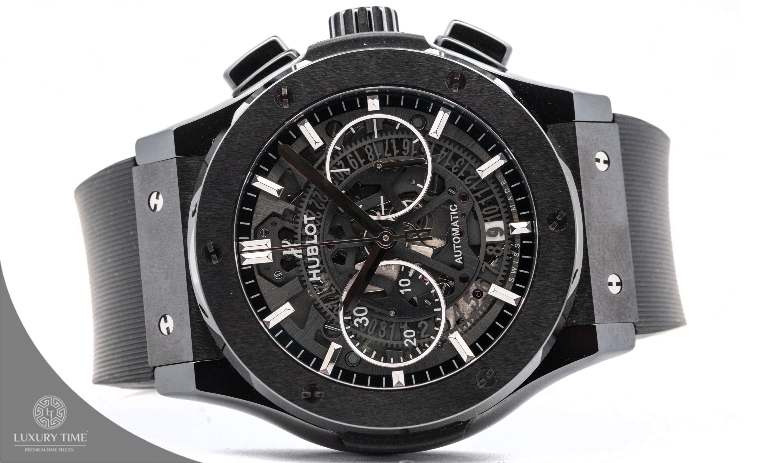 The Hublot Classic Fusion showcases a bold 45mm black ceramic case and a striking skeletonized black dial. Complemented by a black rubber strap and a push-button folding clasp, this timepiece combines modern design with practicality. Powered by an automatic movement, it features a transparent case back, a fixed bezel, and a scratch-resistant sapphire crystal for enhanced durability.