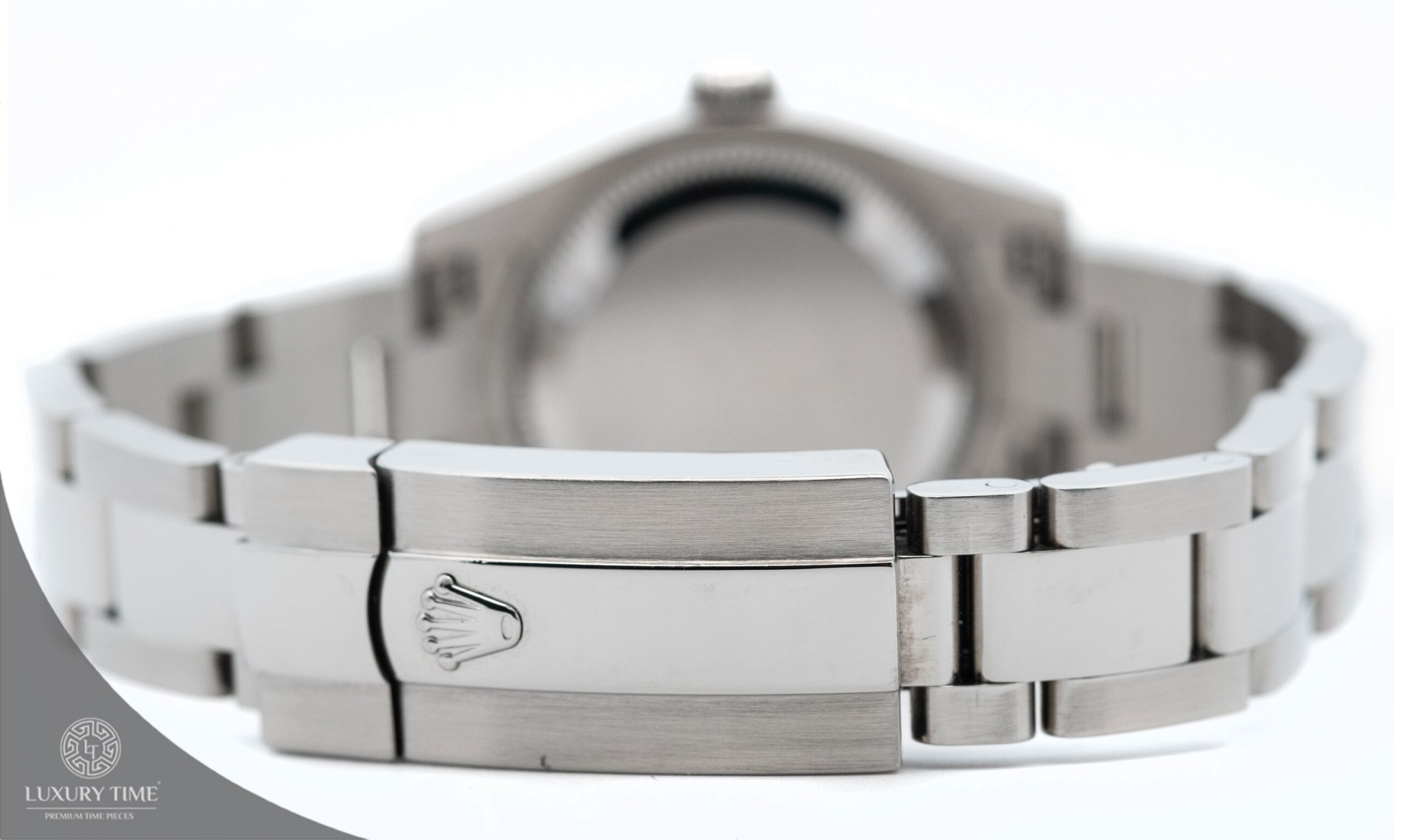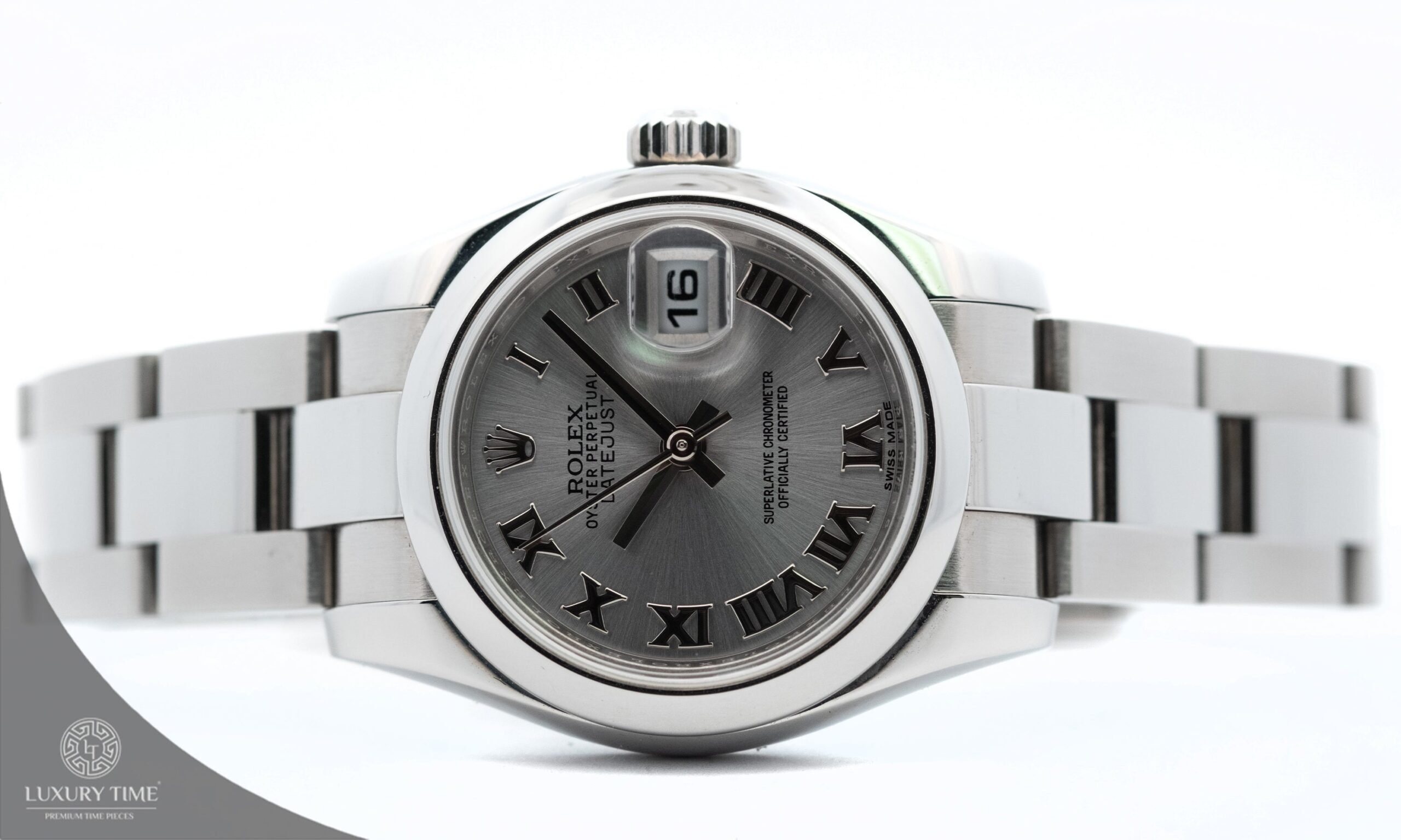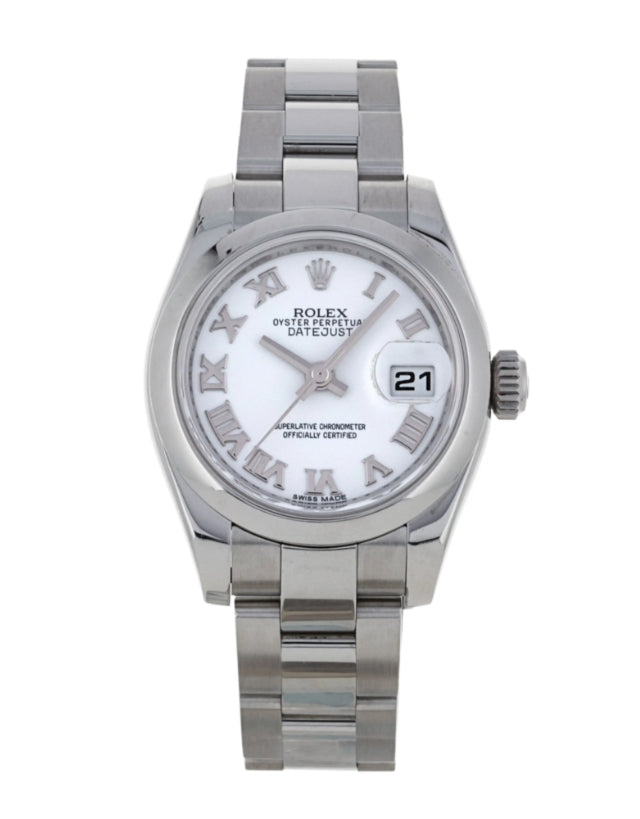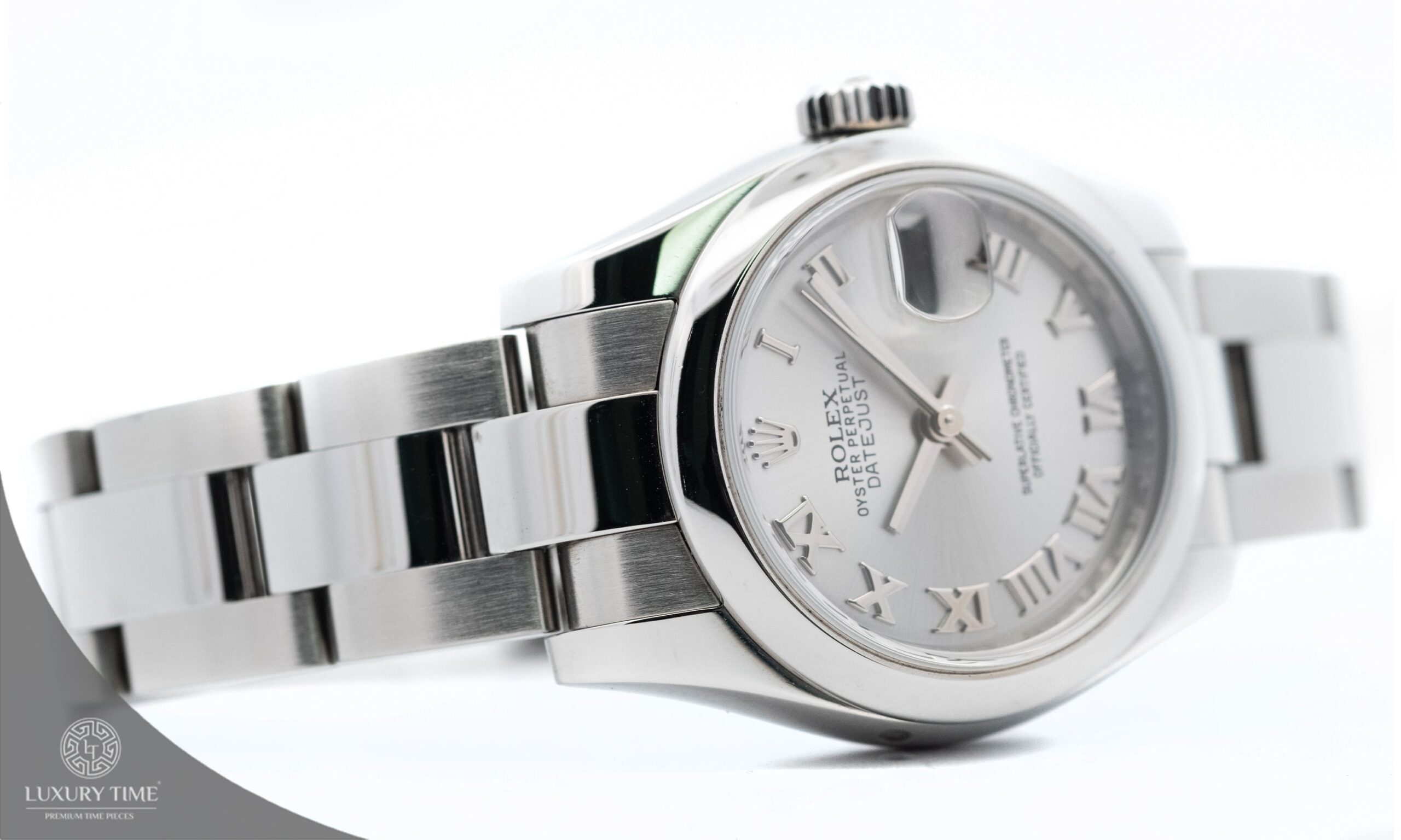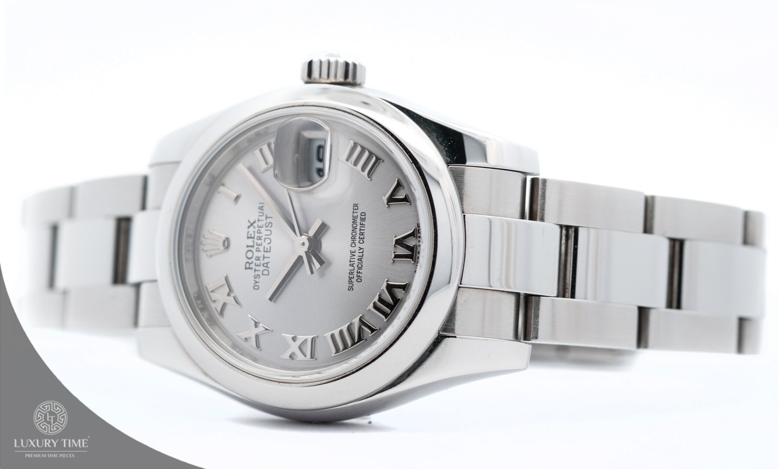 This elegant Rolex Datejust watch features a 26mm stainless steel case, a silver dial with Roman numeral markers, and a matching stainless steel Oyster bracelet. Powered by an automatic movement, the watch is equipped with a fixed bezel, a scratch-resistant sapphire crystal, and a screw-down crown. The case back is solid, ensuring durability and style in a compact design.